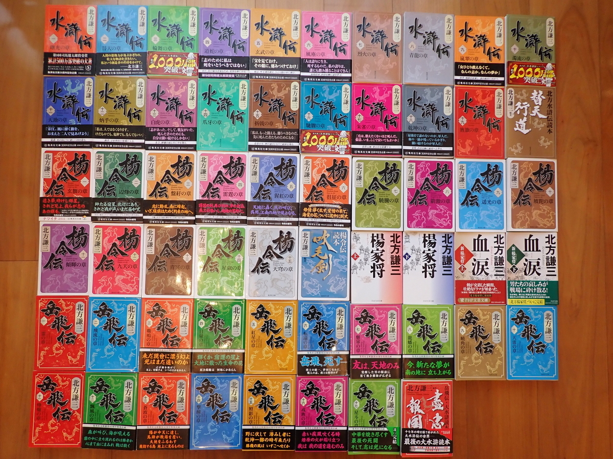 水滸伝全19巻+読本(替天行道)、楊令伝全15巻+読本(吹毛剣)、岳飛伝全17巻+読本(盡忠報国)、楊家将(上)(下)、新楊家将・血涙(上)(下)。